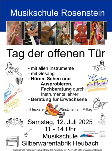 Jeder, der immer schon einmal wissen wollte, was in einer Musikschule gearbeitet wird, ist willkommen – insbesondere natürlich Eltern mit ihren Kindern. Alle Musiksparten sind vertreten. Der Tag der offenen Tür in der Musikschule findet am 12. Juli 2025 von 11.00 Uhr bis 14:00 Uhr statt. Hören, Sehen und Ausprobieren mit Fachberatung durch Instrumentallehrer. Beratung für Erwachsene wird auch angeboten. Info bei der Musikschule Rosenstein 07173 / 91431 250 oder musikschule@rosenstein.de.